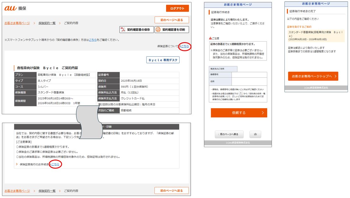 保険証券が必要な場合は「お客さま専用ページ」へログインのうえ、「契約内容の確認・印刷・保存」より保険証券発行依頼の手続きをお願いします。