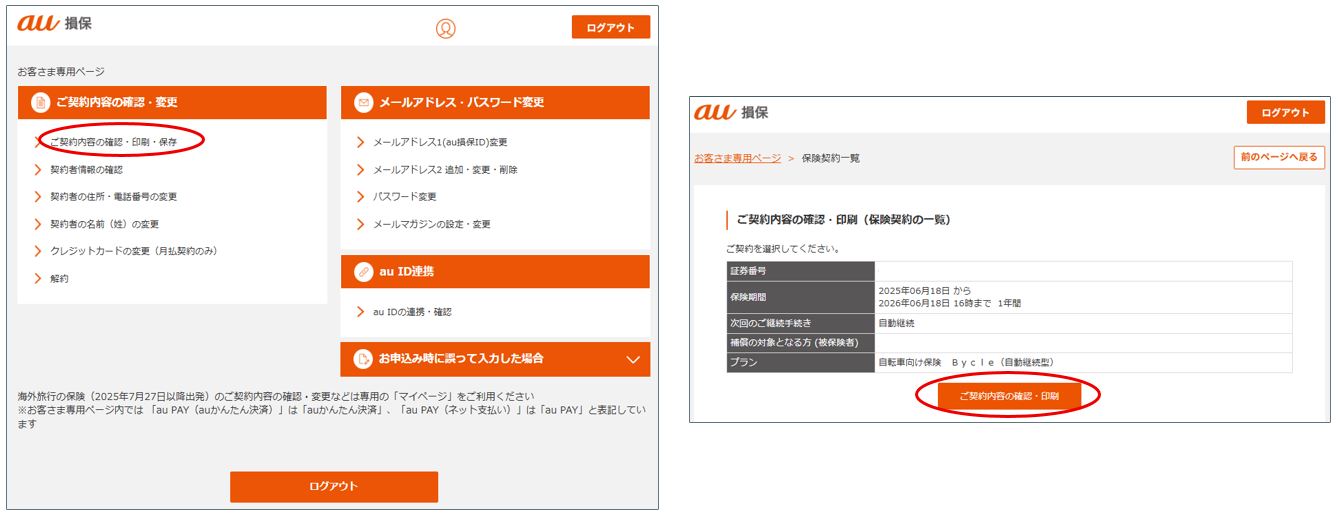 ご契約内容は、「お客さま専用ページ」へログインの上、「ご契約内容の確認・印刷・保存」からご確認いただくことが出来ます。