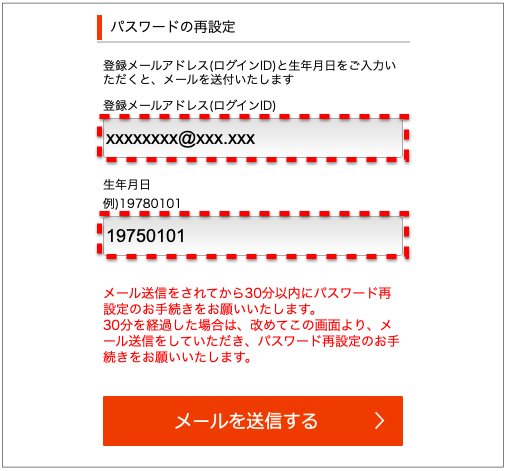 登録メールアドレスとご契約者の生年月日(西暦8桁)を半角で入力