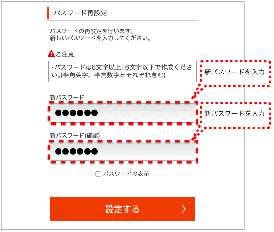 新パスワードを入力(パスワードは半角英数文字を1文字以上含む6~16桁で設定。アルファベットと数字を混合しないとエラーとなります)