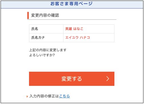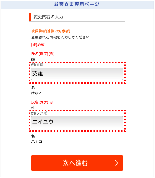 「変更内容の入力」画面で新しい姓を入力し「次へ進む」ボタンを押す