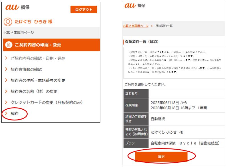 「お客さま専用ページ」にログイン → トップページのメニュー「ご契約内容の確認・変更」から「解約」を選択 → 該当契約を「選択」 → 「解約する」